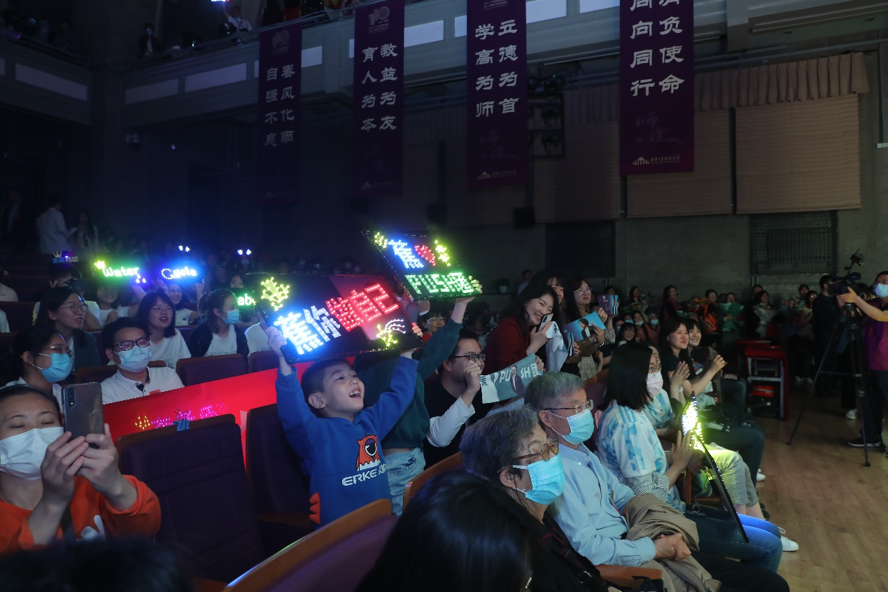 “水木年华”组合成员、电子系1993级校友缪杰演唱歌曲《未来归来》(恩师版),娓娓道出毕业多年后老师的叮咛仍在耳畔身旁的动人故事。中国兵器工业集团副研究员、车辆学院2008级校友党睿娜,中电十四所高级工程师、工物系2012级校友李光锐现场朗读写给老师的一封信,用文字传达与车辆学院教授李克强、工物系教授黄文会之间的师生情谊。中国工程院院士、化工系教授金涌和人文学院教授金丽华作为从教50年以上的教师代表,向全场师生分享了教书育人五十余载的感悟与回忆,化工系教授魏飞和环境学院杜文涛老师分别作为两位老教师的学生,为两位老师献上红围巾和鲜花,表达对清华园里辛勤付出教育工作者的崇高敬意和尊师重教之情。