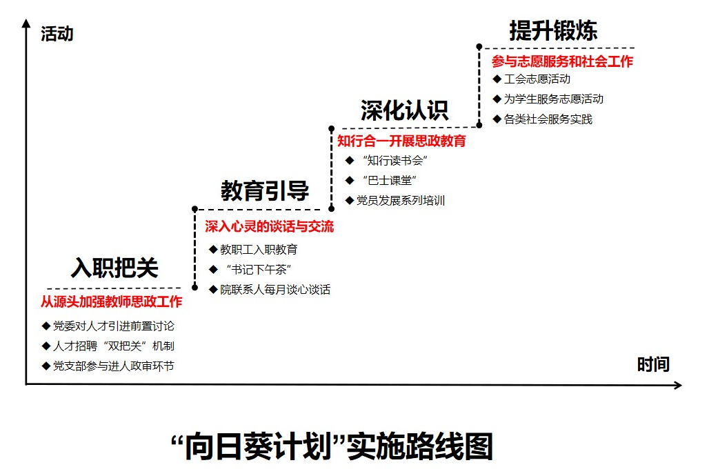 “向日葵计划”是学院针对素质良好、思想进步的教职工实施的特色培养体系。该计划立足于教职工的政治引领和素质提升,以培养和发展学术骨干和青年教师党员为重点。计划的实施过程以“入职把关—教育引导—深化认识—锻炼提升”为主线,由一系列特色工作组成,贯穿教职工从应聘入职到成长发展的各环节。在此过程中调动学院各方面力量,共同参与到党员发展工作中,吸引优秀教职工积极向党组织靠拢,精心培养欣欣向荣的“向日葵”。