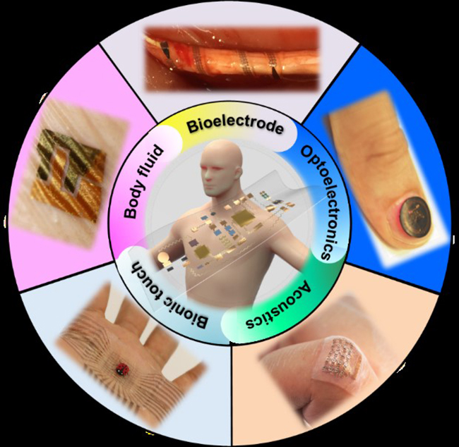 图3 用于生理参数监测的柔性混合电子:柔性生理电器件、柔性光电器件、柔性声学器件、柔性类皮肤功能器件和柔性生化检测器件