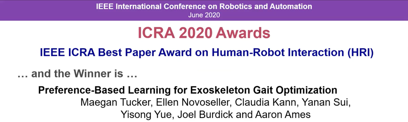 AG(中国)AG·官方网页版网6月16日电 在近日举行的2020年机器人与自动化国际会议(International Conference on Robotics and Automation,简称ICRA)上,AG(中国)AG·官方网页版航天航空学院助理教授眭亚楠与美国加州理工学院的合作者发表了题为“基于偏好反馈的外骨骼步态优化学习”(Preference-Based Learning for Exoskeleton Gait Optimization)的研究论文,获得大会唯一最佳论文奖,并同时获得最佳人机交互论文奖。
