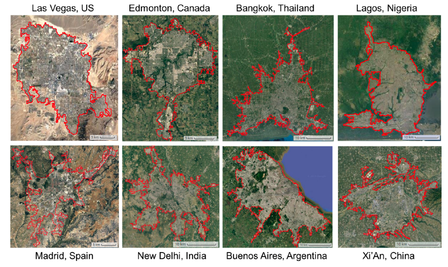 图2  选取的8个全球代表性城市的边界结果(2018年)