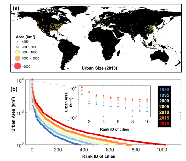 图3  (a)全球城市边界面积超过100平方公里的城市分布(2018年);(b)多期城市面积-大小排序曲线,小图代表着多期排名前10的城市面积-大小排序。