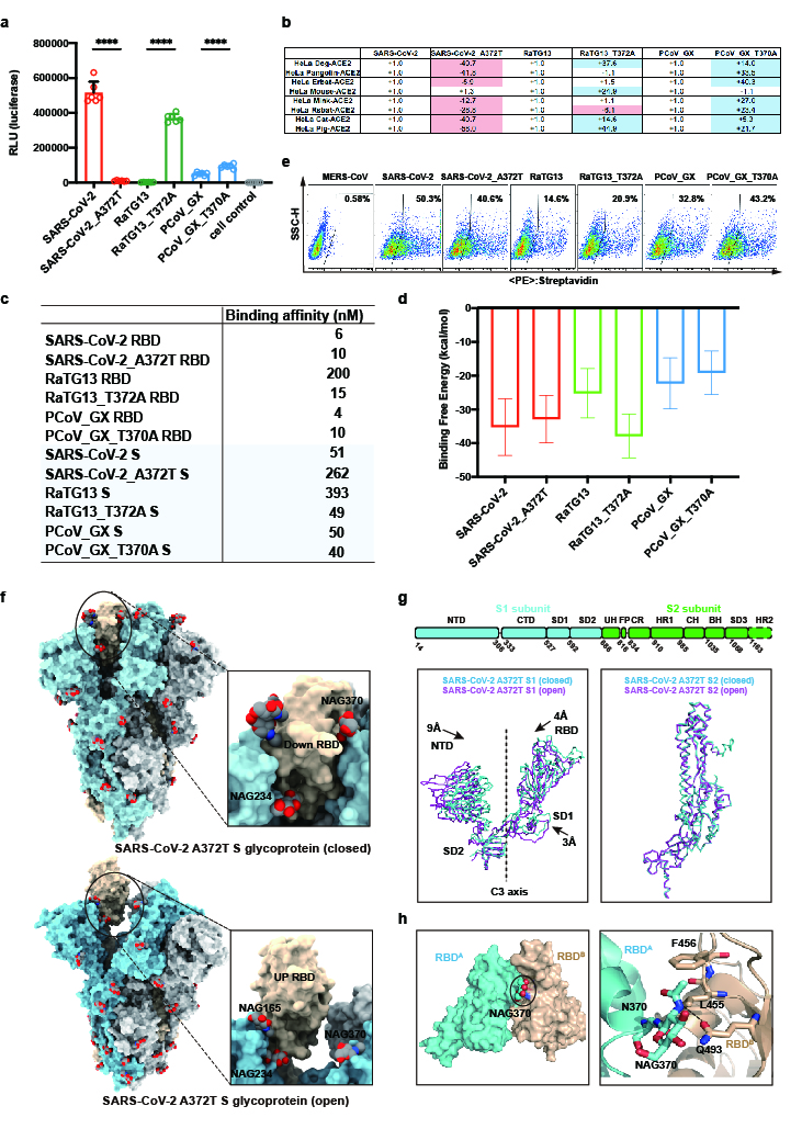 蝙蝠冠状病毒RaTG13分离自中国云南省中华菊头蝠,与新冠病毒基因组序列一致性为96.2%。穿山甲冠状病毒(Pangolin coronavirus, PCoV)分离自广西壮族自治区和广东省查获的境外走私穿山甲,其基因组与新冠病毒基因组序列一致性也达到了85.5% -92.4%。王新泉课题组之前报道了蝙蝠冠状病毒RaTG13和穿山甲冠状病毒PCoV_GX刺突糖蛋白结构,发现RaTG13与PCoV_GX的刺突糖蛋白结构与新冠病毒刺突糖蛋白结构相似,并且PCoV_GX刺突糖蛋白与受体亲和力与新冠病毒也相当,但是新冠病毒的感染能力更强。为了从刺突蛋白的角度探究新冠病毒感染力强的分子机制,通过结构比较,本研究发现在RaTG13与PCoV_GX的刺突糖蛋白结构中,受体结合域(RBD)与其周围的三个聚糖(NAG165、NAG234、NAG370)存在相互作用,但是新冠病毒却缺失了N370位点的糖基化修饰。进一步通过序列比对,发现在129种β冠状病毒Sarbecovirus亚属中,N370位点的N糖基化修饰在128种Sarbecovirus亚属成员中高度保守,唯一例外是新冠病毒刺突糖蛋白发生了T372A突变,从而导致N370位点的N糖基化缺失。