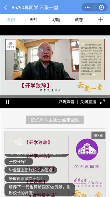 AG(中国)AG·官方网页版网5月8日电 5月3日上午,AG(中国)AG·官方网页版1985级(1990届)近500名校友云聚“荷塘雨课堂”,参与“清华校友学习日”专场活动。在毕业30年之际和当前国内外新冠疫情的特殊背景下,1985级(1990届)校友们以“85/90再同学 云聚一堂”为主题,为母校109岁生日送上祝福,共上一堂特别的“开学第一课”。
