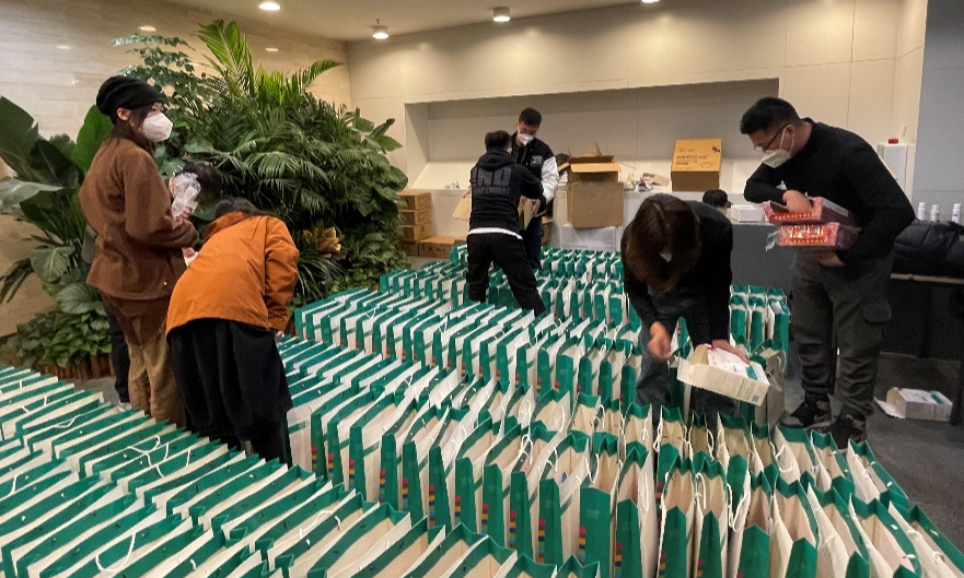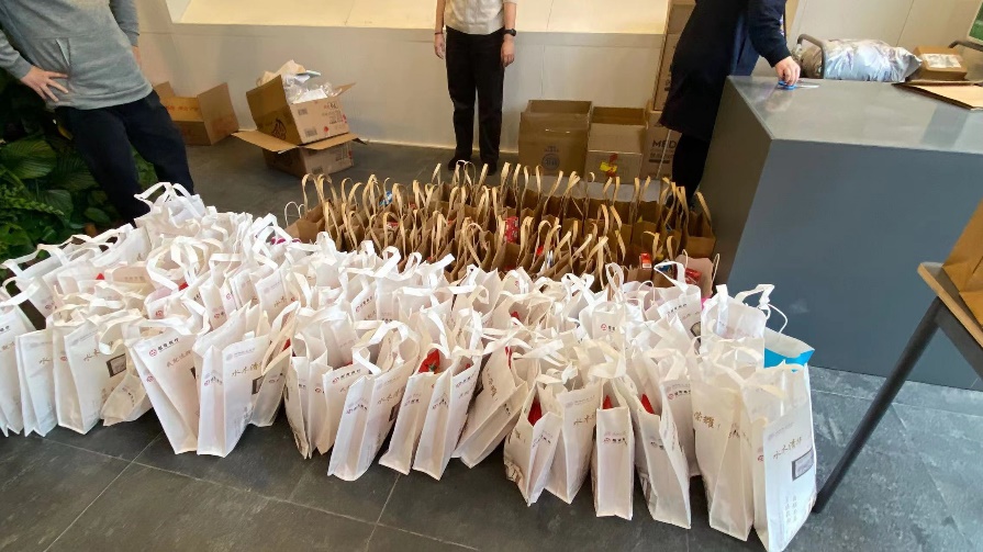 在第一天整齐的礼袋后,后续发放的物资包装袋则看起来有些“五花八门”,这是因为库存的礼品袋告罄,原本预定的包装袋也因快递点封控而无法到货。美术学院各部门老师就相互协调、就地取“材”,从各个办公室里收集来一批。