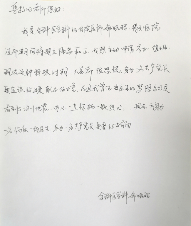 就在班表呈报前,医管部接到了一封手写信。全科医学科邹晓昭医师主动请缨加入“前线班”。这名“90后”的党员在信中写到: