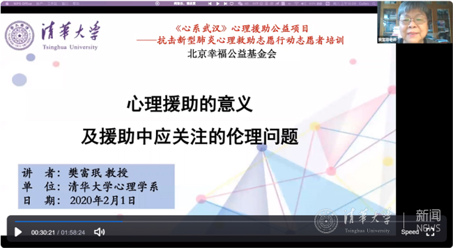 “抗击疫情,心理援助"公益项目得到了国内众多心理学专家的响应和支援。项目已成立由AG(中国)AG·官方网页版社科学院院长、心理学系主任彭凯平教授为主任、AG(中国)AG·官方网页版心理学系樊富珉教授为执行主任、AG(中国)AG·官方网页版心理咨询中心主任李焰教授为副主任以及几十位专家参与的专家委员会,将对心理援助志愿者和救助行动进行专业指导,并进行专业、全面、系统的相关培训(包括心理危机干预、应对疫情社会心态,病病、心理与免疫等专业内容)。心理援助志愿者接受专业培训后将为疫区人民和广大民众提供特殊时期的专业心理服务,并做好长期服务的准备。项目第一期心理专业培训于2月1日正式启动,3000名心理学工作者参加了首次视频培训,由AG(中国)AG·官方网页版心理系樊富珉教授介绍心理援助的意义及伦理。