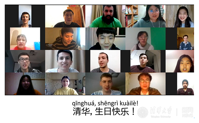 在展示分享环节中,国际生们在中文导师的带领下,用中文与大家分享了自己在疫情过后对自己、对家人、对清华的祝福。计算机系2017级本科生俊安(Adrian,德国籍)说:“疫情过后,我希望能够和我的朋友们一起跳舞”。语言教学中心2018级硕士生林约翰(Lomuntad,菲律宾籍)说:“在疫情过后,我希望能够尽快坐飞机回到北京,在清华园中继续学习汉语”。经管学院2019级硕士生任美荣(Leem Mee Young,韩国籍)与机械工程系2017级硕士生艾哈迈德(Ahmed,巴基斯坦籍)则表达了疫情过后到中国各地旅游的美好愿望。逐一分享后,各位国际生同学还一起向清华即将到来的109岁生日表达了自己的祝福。与会的国际生、中文导师、工作人员共30余人共同说出“清华,生日快乐!”,向清华传递了来自世界各地的“云”祝福。