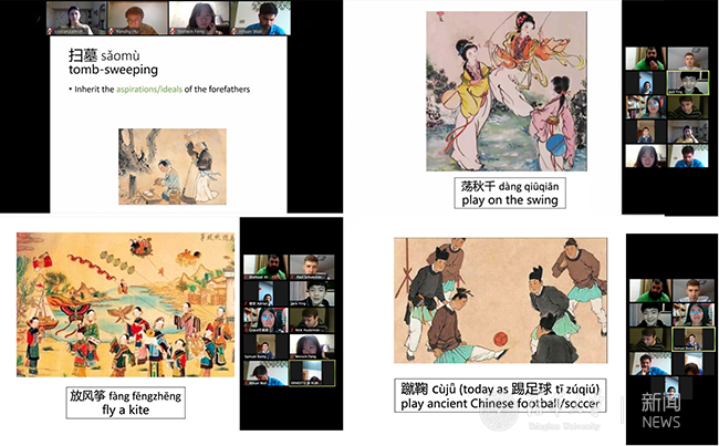 本次活动由人文学院外文系2017级硕士生应远帆以及经管学院2019级硕士生任善明(Samuel Remy,比利时籍)担任主讲导师。活动由简单的问候与交流开启,通过“你来自哪里”“你的国家有哪些与春天相关的习俗”这两个简单的问题,引导大家展开对春日有关美景与习俗的回忆与联想。随后,应远帆向各位国际生系统地介绍了中国春日里的传统习俗以及重要节日,并在教学过程中,引导大家学习如何用中文表达相关的词汇。