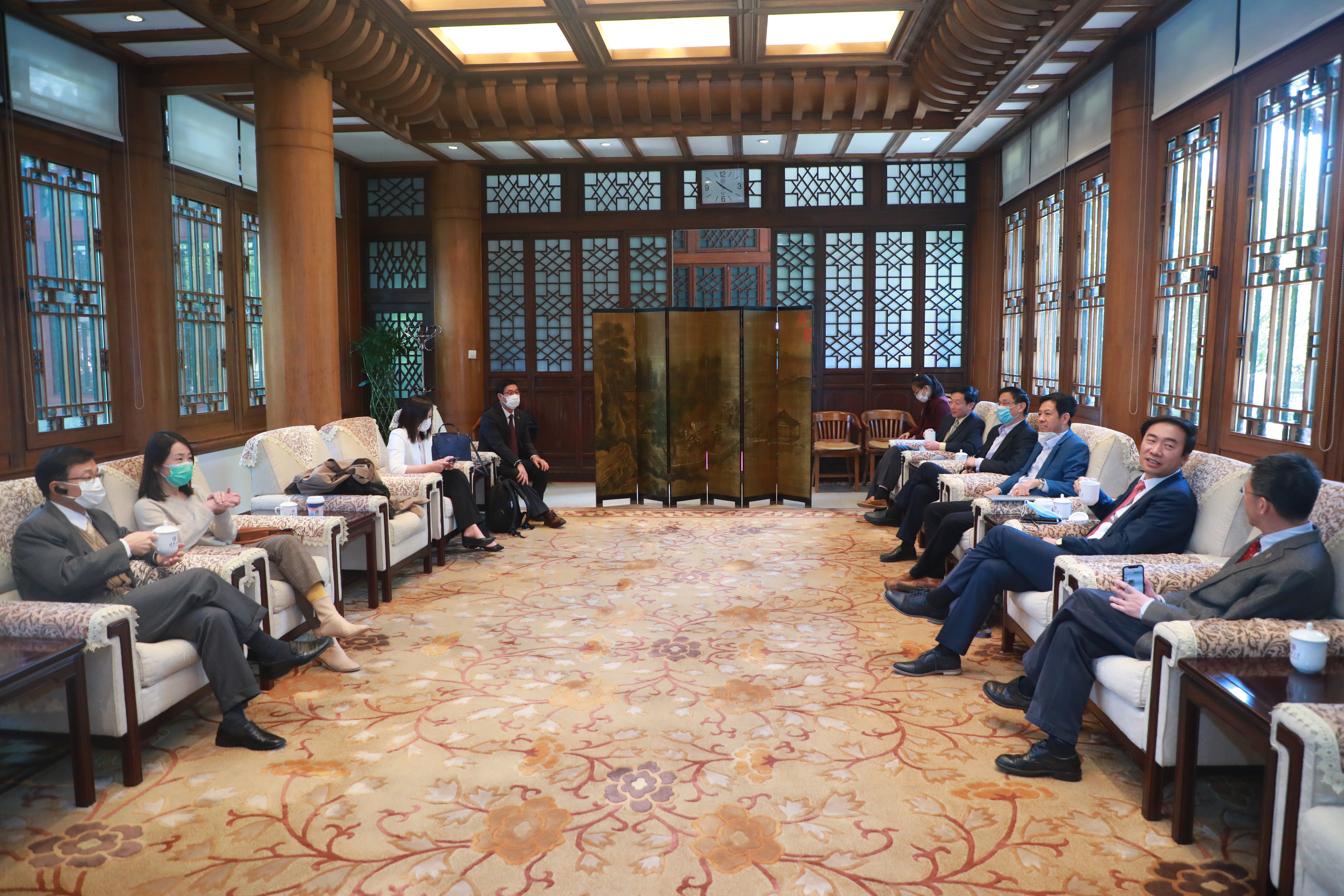 捐赠仪式前,邓锋与史宗恺、陈大同、方方、吴国盛、丁胜、陆漫春、唐杰、袁桅交流座谈。吴国盛介绍了科学博物馆的现有藏品情况,指出科学博物馆的建设是大学深厚历史底蕴自我展开的需要,也是辐射影响惠及社会的需要。邓锋希望有更多校友关注科学博物馆的藏品收集,持续支持科学博物馆的建设发展。丁胜介绍了全球健康药物研发中心运营的特色和目前主要的研究方向,以及面对来势汹汹的新冠肺炎疫情,中心在第一时间向全社会研究机构和科研人员,开放了相关技术平台和药物研发资源的情况。邓锋也希望通过这次捐赠,呼唤社会各界共同参与,加速针对新型冠状病毒的药物研发工作。