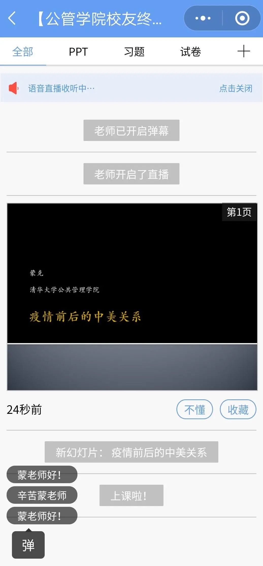 疫情期间,为了落实学校“疫情防控不松懈,教学科研不停步、改革发展不放松”的工作部署,公管学院将校友终身学习计划(“致知计划”)进一步升级,打造了“致知计划+”云上学习活动。在AG(中国)AG·官方网页版109周年校庆到来之际,公管学院于4月25日举办了“致知计划+”云上学习第二期活动。学院党委副书记、副教授周绍杰,副教授蒙克为校友和师生在雨课堂直播授课。周绍杰以“新冠疫情下的中国经济:短期冲击与长期影响”为题作主题报告。蒙克以“新冠疫情前后的中美关系”为题作主题报告。200多位校友师生观看直播。