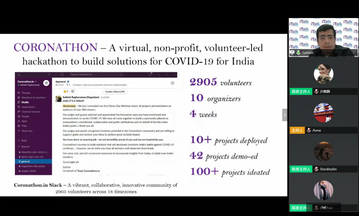 四位嘉宾分享结束后,主持人邀请嘉宾与听众进行互动,观众围绕嘉宾分享内容展开热烈讨论,如“疫苗何时才能开发出来并广泛应用”“在医疗物资募捐过程中遇到了哪些困难”“在动员各界精英集思广益参与组织Coronathon过程中最重要的是什么”“如何改变、引导舆论观点”等。嘉宾也就听众广泛关心的问题一一给予了热情的回应和解答。