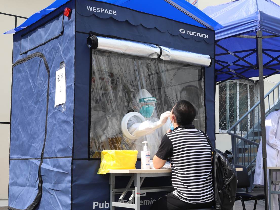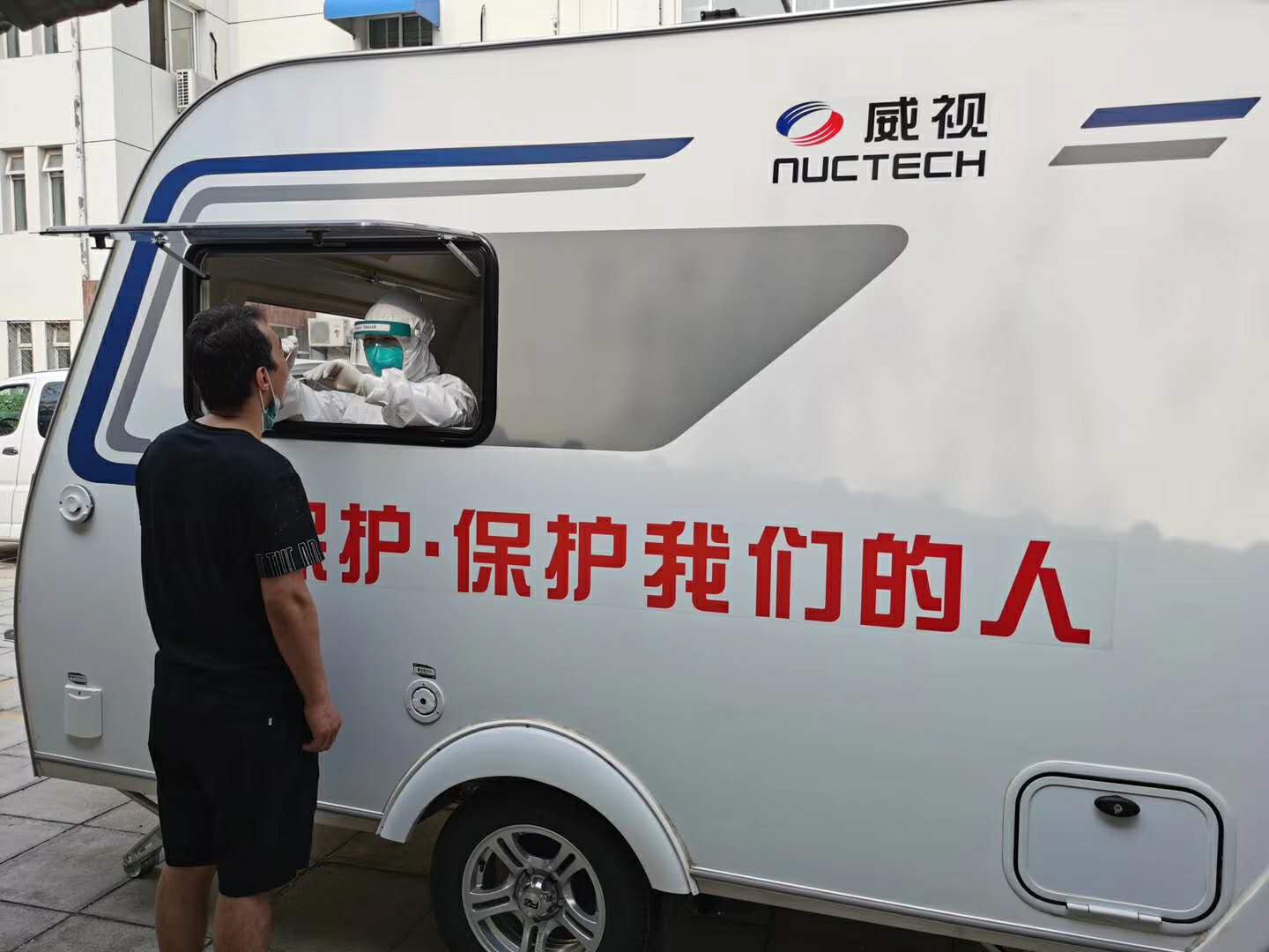 AG(中国)AG·官方网页版校医院医护人员在同方威视防疫检测移动舱内进行核酸检测工作