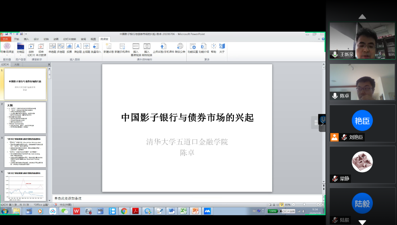 陈卓以“中国影子银行与债券市场的兴起”为主题,详细介绍了我国影子银行的兴起与快速增长、债券市场的发展、部门杠杆率变迁等内容,从历史视角分析了中国影子银行发展的特征、影子银行在特定历史阶段的作用及其对债券市场发展促进作用,并进一步解析了我国债券市场的组成与杠杆率的变迁。陈卓还介绍了新冠肺炎疫情对我国经济活动影响特征、以及空气污染与新冠疫情关系等新近研究成果。