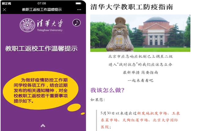 秉承“一次测温、多次应用”“守人有责、守土有责”的原则,信息办牵头开发研制出基于“清华紫荆”小程序的健康监测和轨迹追踪系统。从5月7日基本建设方案通过,到6月6日整套系统上线运行,“清华紫荆”以百米冲刺的速度诞生。