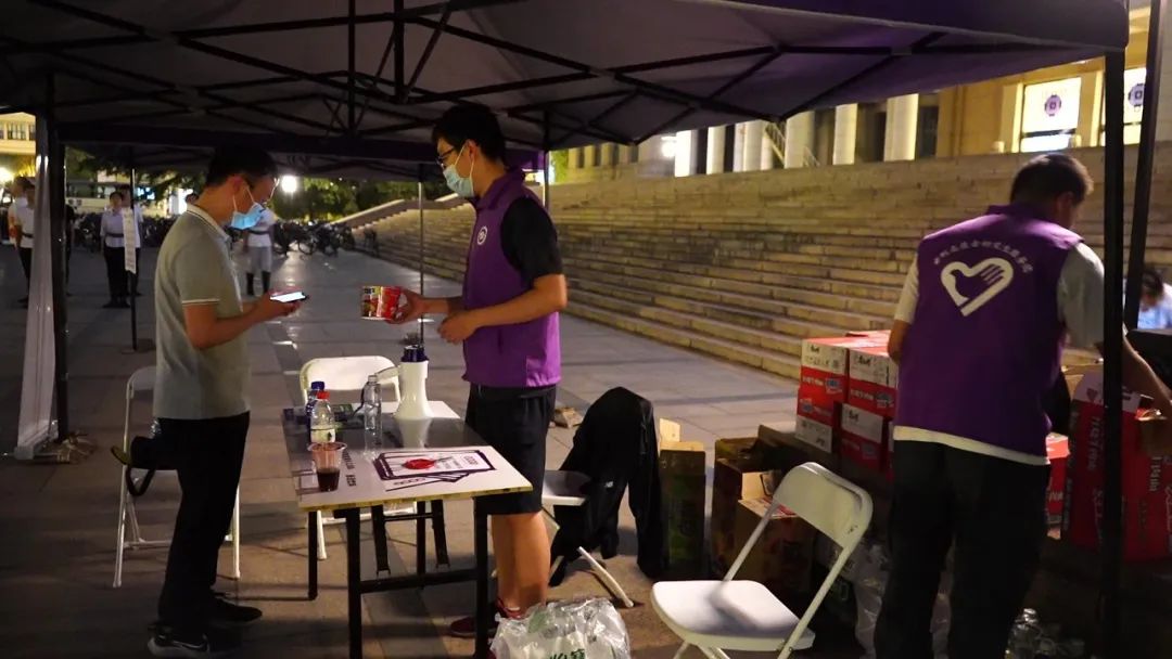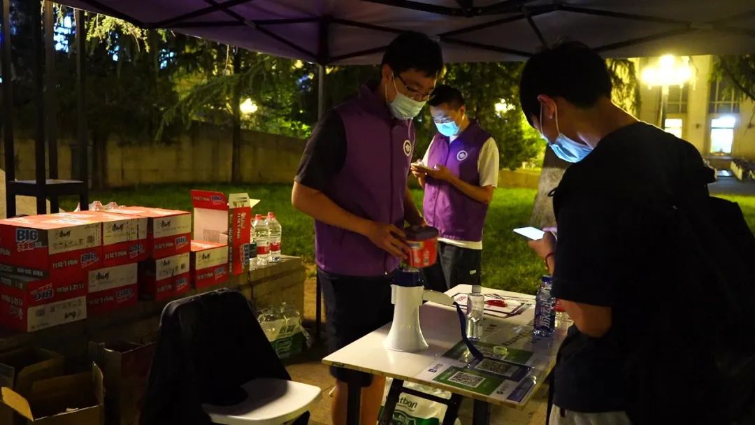 大桶的矿泉水、冰爽的“脉动”、火辣的牛肉面在帐篷内外占据一席之地,身穿紫色和红色马甲的志愿者来回忙碌。“10元,拿好,这边扫码!”“我帮你搬过去”“记得告诉其他同学哦”......清澈的话语中,志愿者们熟练又认真穿梭于同学间。