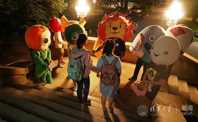 学生会的同学们穿着玩偶服在凌晨的老馆为同学们发糖