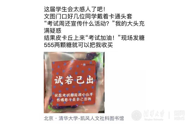 每年的期末考试周都是大部分清华学生压力最大的一段时间,考试一场又一场,课程论文的提交也迫在眉睫,图书馆、自习室里总能看到同学们埋头学习的身影。为了给同学们解压,校学生会的同学们想起,曾经看到其他高校的同学在考试周期间穿着玩偶服为大家发糖,如果我们也能在图书馆门口为前来自习的同学送上温暖的糖果,或许可以帮助同学们放松心情。不仅如此,学生会也希望能够提醒同学们在期末考试周期间注意休息、劳逸结合,保持高效专注。更重要的是,不能因为论文压力大、考试难度高就放弃诚信原则,要坚决做到论文不抄袭、考试不作弊,端正学术态度。