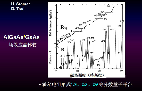 还有其他更奇怪的地方。随着半导体工业的发展,我们可以用砷化镓或砷化镓铝代替硅,做成高速的场效应晶体管。1982年,美国物理学家崔琦和施特莫发现当把一种半导体换成另一种半导体、在两维的体系中做类似测量时,不但在整数的地方,而且在1/3、2/3、2/5的地方也出现平台。(图2)这就是分数量子霍尔效应。这个效应不久由另一位美国物理学家劳弗林给出了理论解释,他们三人分享了1998年的诺贝尔物理学奖。