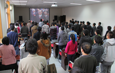 公管学院一层报告厅师生观看十八大直播现场。