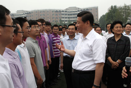 下午6时许,中共中央政治局常委、国家副主席习近平来到紫荆操场,受到师生们的热烈欢迎。看到一张张青春焕发的面孔,习近平十分高兴。他走到正在做准备活动的国防生方阵和即将奔赴基层的毕业生方阵中,与大家亲切交谈起来,详细询问同学们的学习成长情况和到基层工作的志向。
