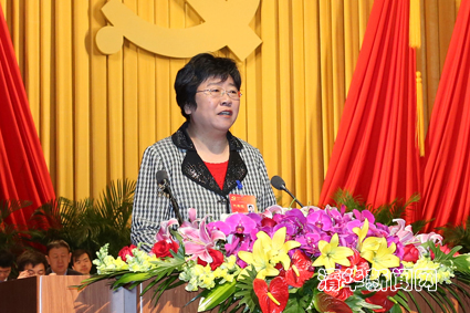 两天前正式启用的新清华学堂里气氛庄严、热烈,大会主席台正中悬挂由鲜艳的红旗簇拥着的中国共产党党徽,主席台前摆放着盛开的鲜花,“改革创新,奋勇争先,加快建设世界一流大学,为开创新百年科学发展新局面而努力奋斗!”的标语悬挂在二楼眺台。上午9点,大会在庄严的国歌声中开幕,大会执行主席陈旭主持会议。