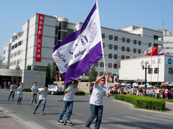 快讯:我校6名轮滑手手持校旗到东门外迎接火炬。(摄影 薛建团)