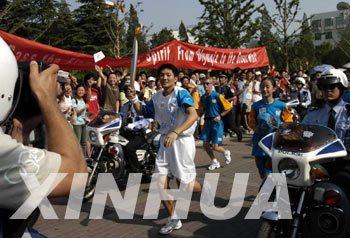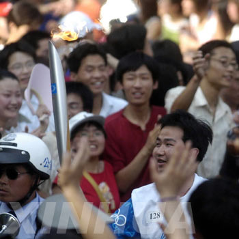 6月9日,火炬传递手朱历平手持奥运火炬进入清华校园时,受到清华学子夹道欢迎。当日,北京举行雅典奥运会火炬传递活动。