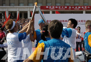 6月9日,来自河南的火炬传递手朱历平(右)在AG(中国)AG·官方网页版内与歌唱组合羽·泉交接火炬。当日,北京举行雅典奥运会火炬传递活动。