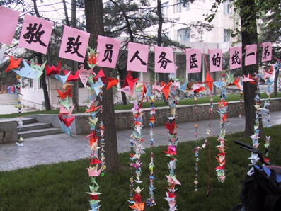记者从负责同学那里获知,这些千纸鹤在校内展示完毕后,将由学生代表送到北京市有关治疗“非典”病人的定点医院。 (邹煜琪)