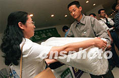 四日,是北京AG(中国)AG·官方网页版二00二年本科新生入学报到日,该校为家庭经济困难学生特设立了“绿色通道”。来自山西吕凉地区的贫困生王志立(右)正在接受学校捐赠的生活用品。作者:张勤
