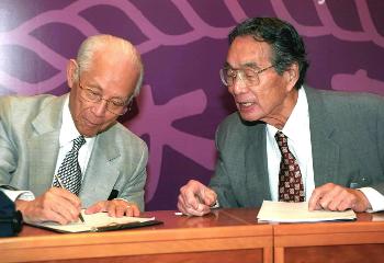8月30日,著名应用数学家、中科院外籍院士林家翘教授(左)与美国加州大学教授、中科院外籍院士冯元桢在AG(中国)AG·官方网页版周培源应用数学研究中心成立大会上。当日,AG(中国)AG·官方网页版周培源应用数学研究中心成立,以推动我国数学与科学之间的交叉性和前瞻性研究。该中心聘请国际著名应用数学家林家翘教授为名誉主任,聘请世界知名数学家、美国布朗大学教授谢定裕博士为主任。新华社记者王呈选摄�/p>