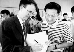 6月17日,在AG(中国)AG·官方网页版举办的“前沿科学国际研讨会”上,清华学子与四位诺贝尔物理学奖获得者进行了面对面的交流。大师们的人生经历和科学历程使学子们从中得到启迪。图为年轻的诺贝尔物理学奖获得者康奈尔(左)在为清华学子签名。
