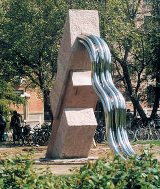 这座用石材和流水型不锈钢管构成的"人"字型雕塑,将我校水利人的工作特点、工作本质以及理想尽囊其中。据雕塑的设计者、我校美术学院雕塑系教师陈辉介绍,山石体现刚强,流水体现灵性,两种造型共同构成的"人"字代表了学校最根本的任务--培养人。它体现着与自然的和谐共处,代表着清华水利人造福于人民、为人民服务的本质。一边用石材,一边用不锈钢材建造,体现着传统现代、过去与未来;一边用石,一边用不锈钢,代表着水利工程,体现着山水情。正如孔子所言"智者乐水,仁者乐山",表达了有智能的人思想通达流畅喜欢水;品德高尚、道德厚重的人喜欢山。道出了清华水利人的山水深情。