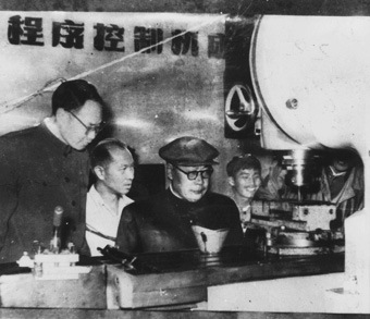 ▲陈毅副总理在蒋南翔校长陪同下参观程控机床实验室。(梁文骏 摄)