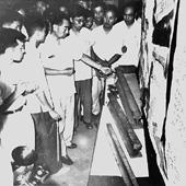 ▲1958年,周恩来总理在焊接实验室视察“电渣焊”技术。 (梁文骏 摄)