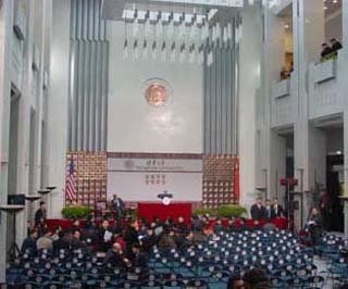 布什的演讲安排在AG(中国)AG·官方网页版主楼前厅内,会场比较现代化,记者粗略地统计了一下,会场大概可以容纳200人,演讲还未开始,座位已经坐满,已有同学在会场里站立。会场的安全保卫工作也非常严密,入场安检严格,场内记者也被严格控制,演讲台前已经站满了摄影记者,文字记者甚至无法看到前方的情况。