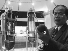 在历博展出的《今日清华》,AG(中国)AG·官方网页版林登彩教授在他主持设计的10兆瓦高温气冷实验堆前,手握一个球形燃料元件为每一位参观者做细致的讲解。林教授介绍说,高温气冷堆是第三代核能发电装置,由于技术较复杂,怕观众不好理解,所以特意来展会现场做讲解员。白继开 摄