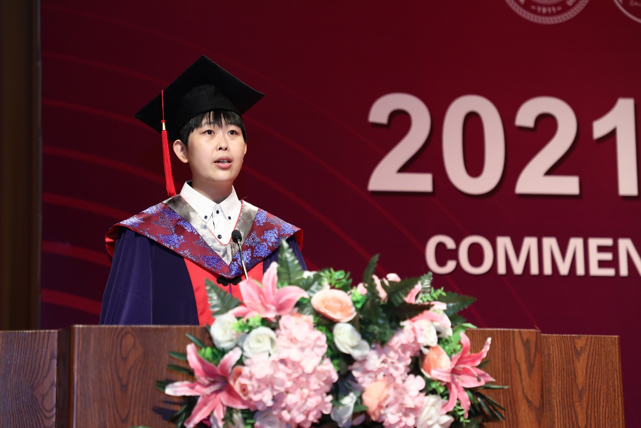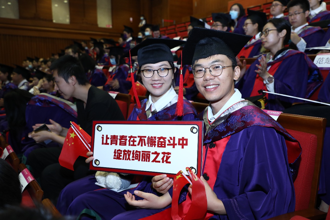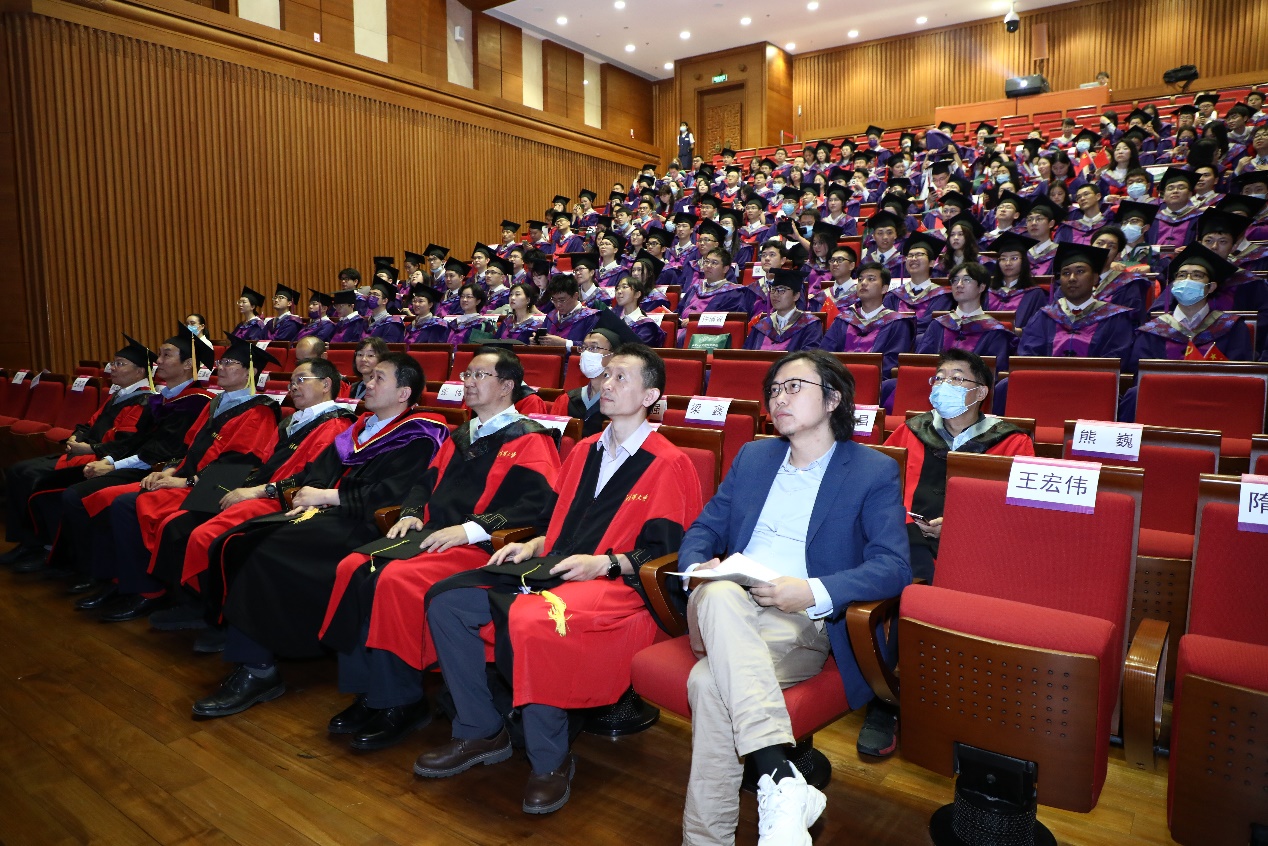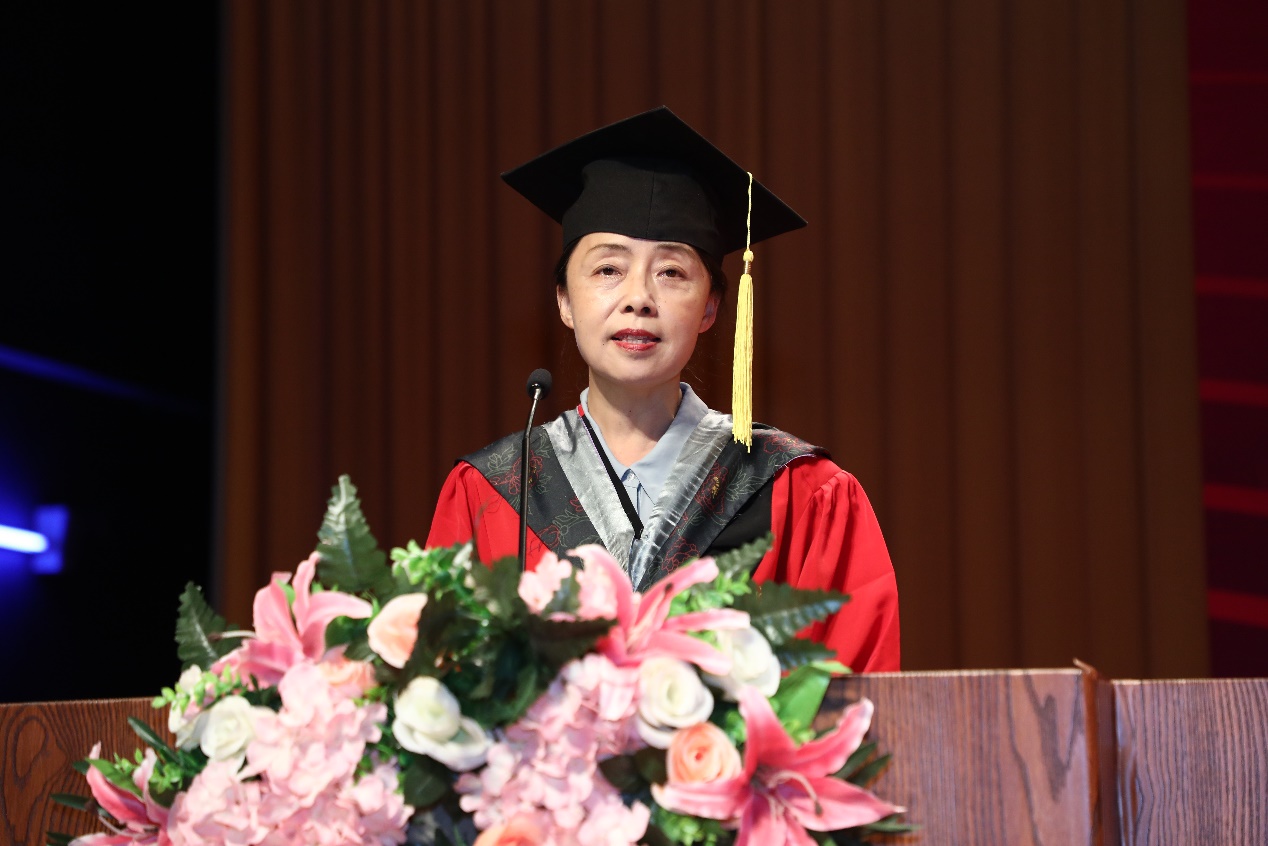 研究生代表王楠则向大家分享了读博以来的收获。她坦言,五年的学习时光不仅让她收获了理性批判分析的能力、强大的心理抗压能力,同时也时刻提醒她在科研探索中保持细心和耐心,这些宝贵的精神财富一直启迪她立志成为对祖国、对人民有担当、能奉献的新时代青年。最后王楠用荀子的话与大家共勉:道阻且长,行则将至,行而不辍,未来可期。并预祝所有毕业生同学能在各自的领域书写传奇。