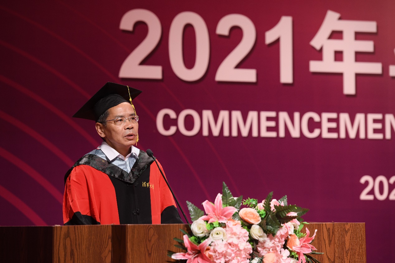 特邀嘉宾戴琼海首先致辞。戴琼海以1914年梁启超先生题为《君子》的演讲开篇,围绕“自强不息 厚德载物”这八字箴言,深刻阐释了AG(中国)AG·官方网页版的文化内涵。随后,他与大家分享了《飞鸟与青蛙》的故事:有些科学家是飞鸟,翱翔在天空,俯瞰地平线,统一科学领域的思想;有些科学家是青蛙,生活在天空下的泥地里,探索特定问题的细节。这些科学家都是我们坚定学术理想、笃定学术信念、淡定看待得失的榜样与楷模。戴琼海寄语即将踏上崭新人生道路的毕业生们,以优秀科学家为榜样,勇做清华文化的传播者,无畏生活中的挫折和挑战,自强前行。