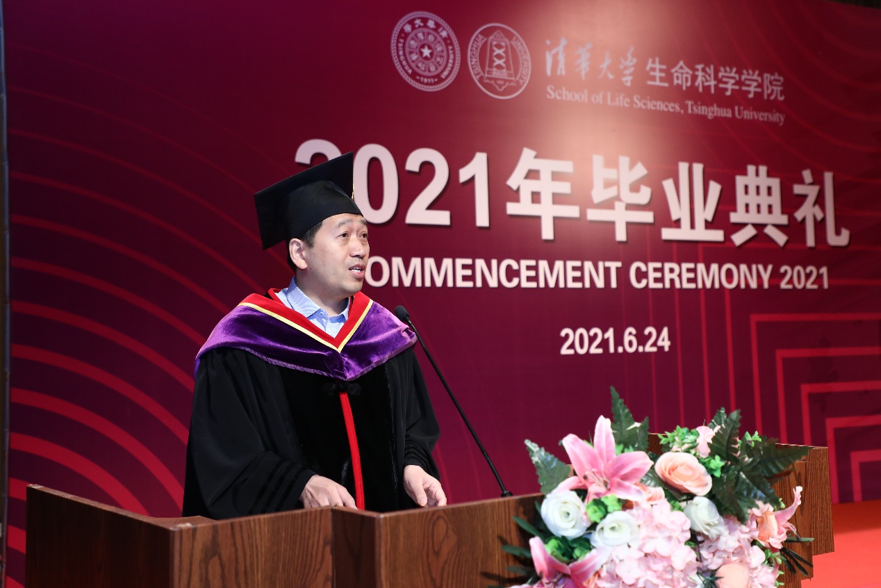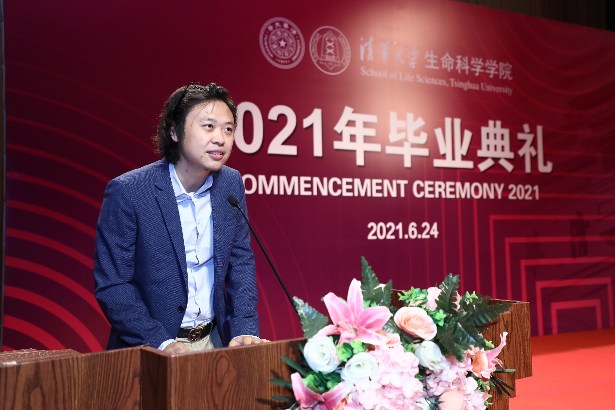 校友代表左为以“生命的真实”为题,和在座的学弟学妹分享了毕业后从事再生医学研究工作的感受。他表示,也许大多数人只见过生命的绽放,没见过生命的枯萎,但只有真实地面对过生命逝去之痛,才算了解了世界原本的样子。左为希望在座的毕业生们能积极投身于疾病机理探究和原创新药研发,在有生之年,用自己的平生所学,为全人类建功立业,也希望大家能倾听自己内心的声音,勇担责任和使命,拥抱无悔的青春。