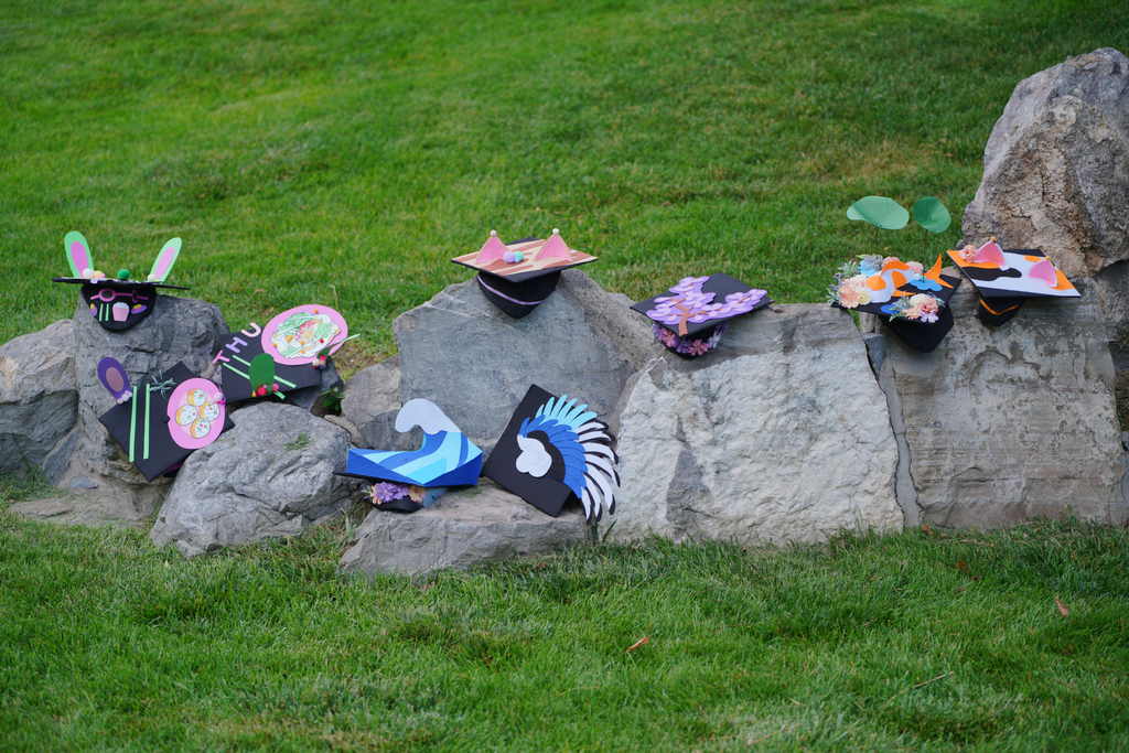 毕业生展示亲手设计的毕业帽