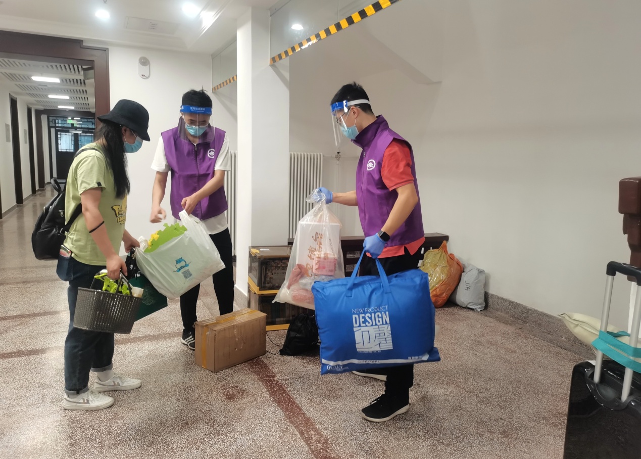 “同学,你好!”怀抱梦想的新生们陆续来到学校,志愿者们分工明确、亲切热情地迎接新同学。校门外的志愿者们耐心解答新生及家长的问题,细致核查每一位入校同学的录取通知书、通信行程码、北京健康宝以及清华紫荆码,为每一位通过信息查验的新生发放“二零二一 同向同行” 的紫色贴纸,开启入校的第一份仪式感,传达对新生的第一份美好祝愿。部分新生行李较多,东北门、紫荆落客区设置了免费电动板车帮助新生运送行李,志愿者们热心地帮助新生搬运行李,细心引导新生前往院系、C楼迎新点。各院系志愿者、社区德育助理、学生楼长、楼委会成员等也加入宿舍楼志愿者队伍,帮助新生接受及搬运行李,提供一站式服务。