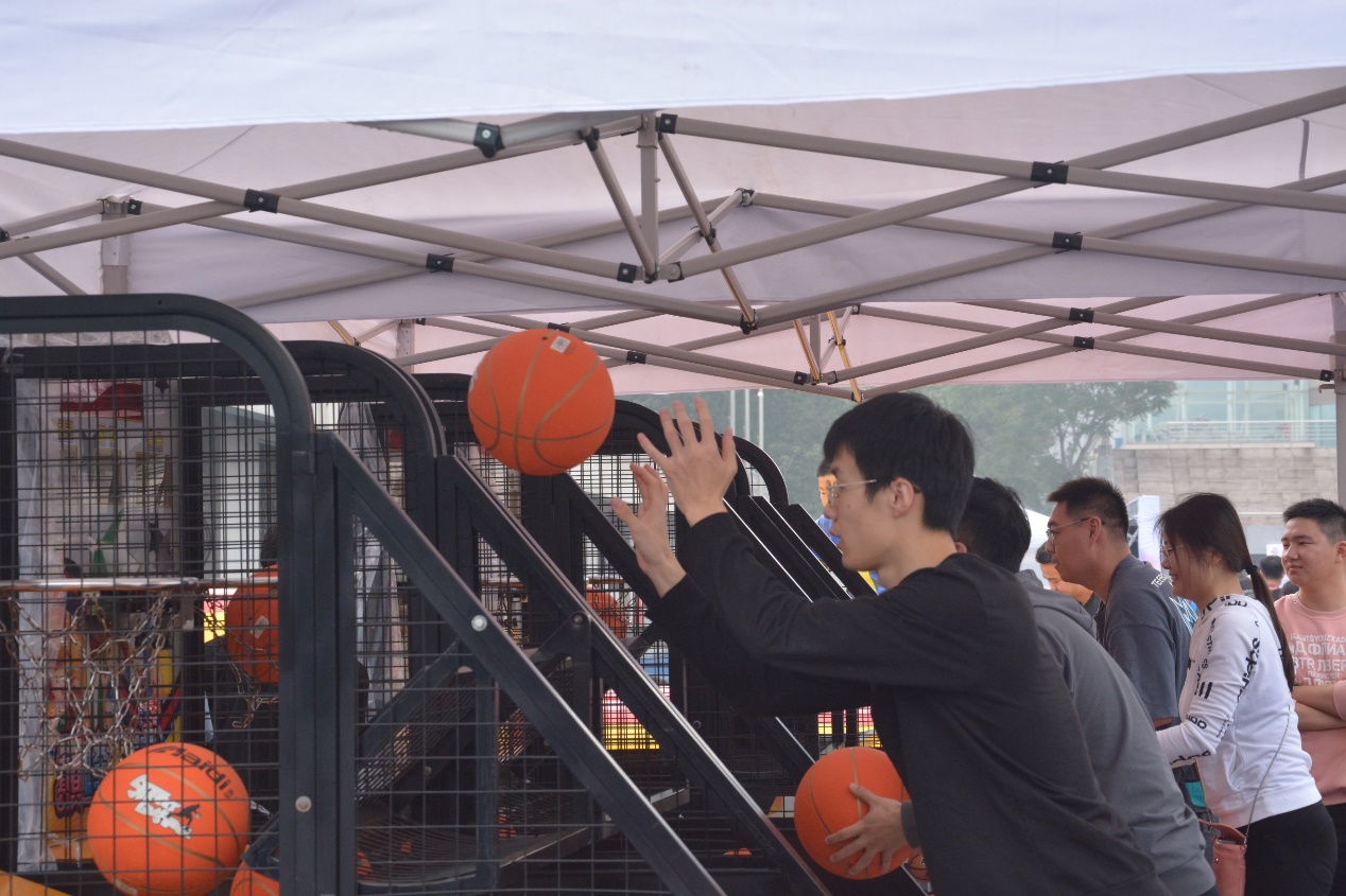 趣味嘉年华设有趣味团体项目、趣味个人项目和陆地冰壶体验项目。团体项目采用闯关制,包括足球飞镖、袋鼠跳投篮、摸石头过河、乒乓托球接力跑、跳高敲锣。个人项目包括台式冰壶、投篮挑战、冰球撞击、沾沾乐、投箭入壶。陆地冰壶体验项目设置了专业的陆地冰壶赛道和花岗岩材质冰壶,配备专业教练指导。嘉年华现场热闹非凡,共有来自10个院系12支队伍(包括7个课题组队伍)的76名师生参加了团体项目,203位同学通过“清动圈”小程序报名参加了个人项目。