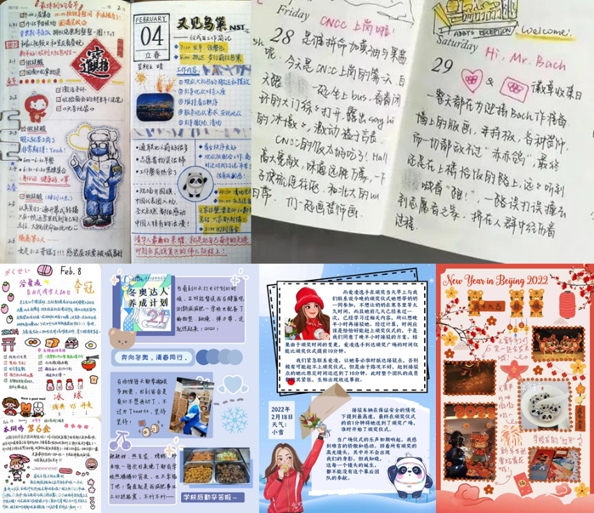 为丰富冬奥志愿者闭环和健康观测期间的生活,“我的冬奥手账”作品征集活动鼓励志愿者们通过制作冬奥主题手账,记录参与冬奥志愿服务的难忘经历和动人故事。城市服务组志愿者、材料学院2021级硕士生廖阳在手账中记录了自己在志愿服务过程中的点点滴滴,从出征仪式中邱勇校长的赋诗,到除夕夜的画糖画写春联,再到冬奥开幕式当天的工作现场和所思所感,以及闭环期间的生活状态和观看冬奥赛事的激动心情,生动展现了清华志愿者服务冬奥的饱满热情和积极心态,也让同学们更加了解志愿者的日常,看到志愿服务背后的故事。