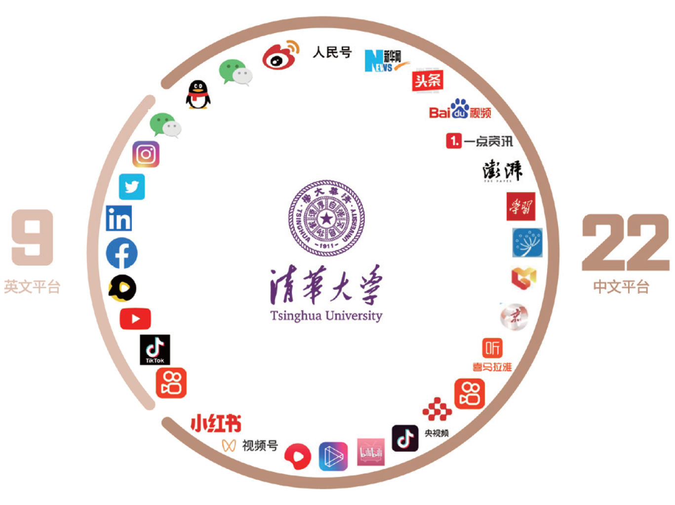进一步整合海内外传播资源,打通中英文传播平台,制定实施学校《全球传播工作行动计划》,探索制定分学科的全球传播行动方案,形成统筹联动、分工协作、特色鲜明的全球传播工作体系,连续三年蝉联中国大学海外网络传播力第一。举办“大学形象对外传播”相关论坛,联合18所高校发布《关于加强大学国际传播工作的倡议》。建有Facebook、Twitter、Youtube及抖音海外版、快手国际版等9个校级海外社交媒体账号,形成多语种平台协同联动矩阵,年均发布各类信息或短视频、融媒作品6500余件,围绕“气候变化”“在线教育”“人工智能治理”“公共卫生与健康”等重点国际议题,开展系列化、区域化、分众化传播。2020年起推出英文直播,合计230余场次,有效触及人群超过2000万。组织开展“联结清华#Connect Tsinghua”“同行清华#Tsinghua In Action”等全球线上互动活动,180余万人次参与,覆盖88个国家及地区、24种语言。建设全球记者库,持续开展“清华会客厅”媒体沙龙,年均接待外媒来访150余次。与新华社、中国国际电视台、中国日报、中国外文局等“外宣国家队”开展深度合作,充分发挥Z世代青年全球传播学生使者和专家优势,面向海外受众讲好清华故事和中国故事。
