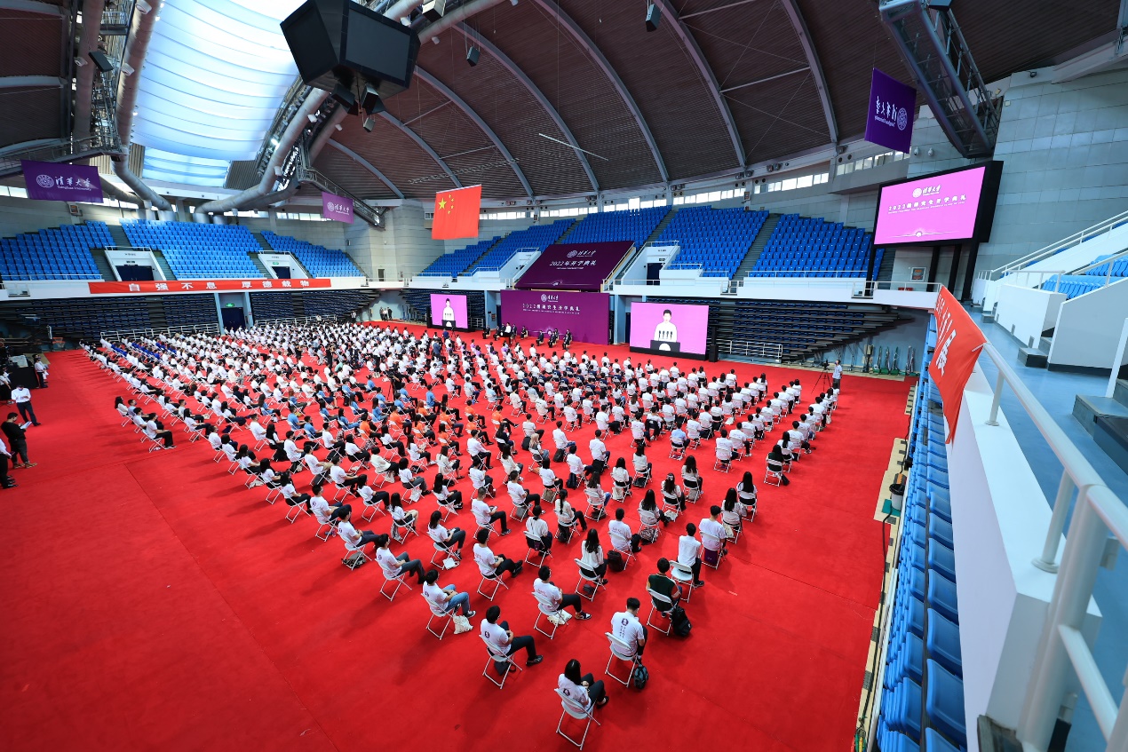 鉴于当前的疫情防控形势,本次开学典礼采用线上线下结合的方式举行,线下设置了34个会场,并通过雨课堂平台同步双语直播。近500名新生代表在综合体育馆主会场参加典礼,5000余名新生在分会场观看现场直播。