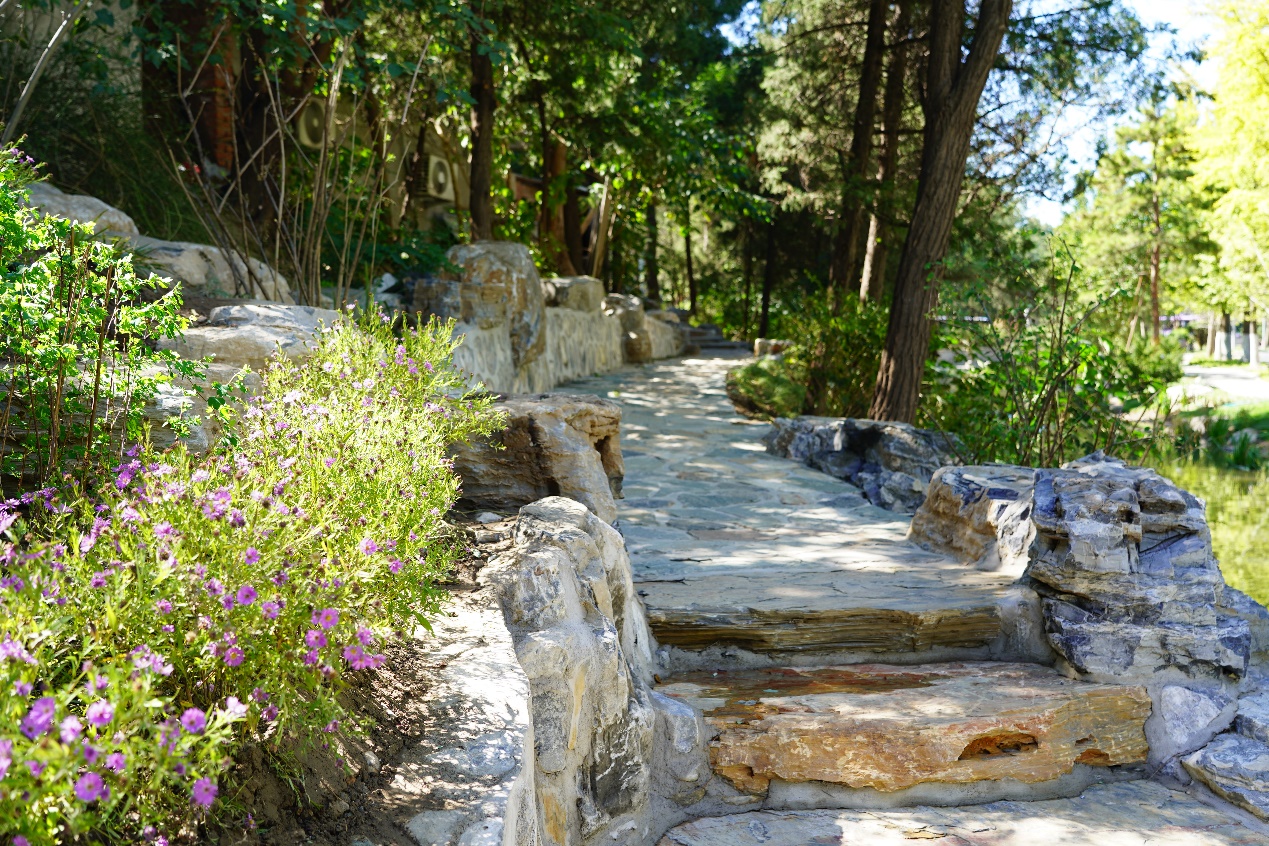 在整个项目中,最为棘手的是对南岸山坡的处理。山坡隔离了家属区和教学区,坡度较大,树木杂乱无章,一直是座不起眼的“荒山”。为了“激活”山坡,便利用石头和毛石挡墙进行护坡、固土。经过反复实地勘查和测绘,工程师梳理出一条蜿蜒起伏的游园路径,铺设古朴的青石板,形成一条林下小径,使行人得以感受曲径通幽的自然野趣。