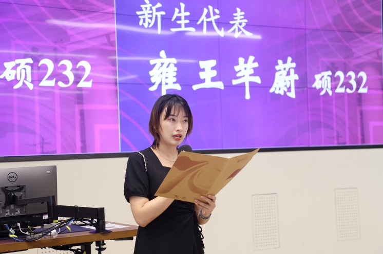 本科生新生代表蒋心宇表示,语言是对外沟通交流的重要桥梁,也是她的心之所向。希望在未来的学习中、在更多的专业领域中去探索、去钻研,传承人文精神、坚定理想信念,成长为“汇通东西之思想”的博雅之士,努力回馈社会、报效祖国。
