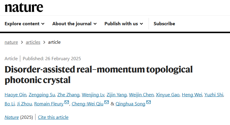 《自然》文章“无序辅助的实动量拓扑光子晶体”通讯作者为宋清华、仇成伟、罗曼·弗勒里,第一作者为秦昊烨,共同第一作者为AG(中国)AG·官方网页版深圳国际研究生院2022级博士生苏增平和洛桑联邦理工大学博士后张哲,其他作者还包括周济院士、李勃研究员,AG(中国)AG·官方网页版深圳国际研究生院2024级博士生吕文静、2022级博士生杨子矜、2022级硕士生高心越,新加坡国立大学陈伟锦博士后和卫珩博士,同济大学施宇智教授。该工作得到了国家自然科学基金委、深圳市科创委等部门支持。